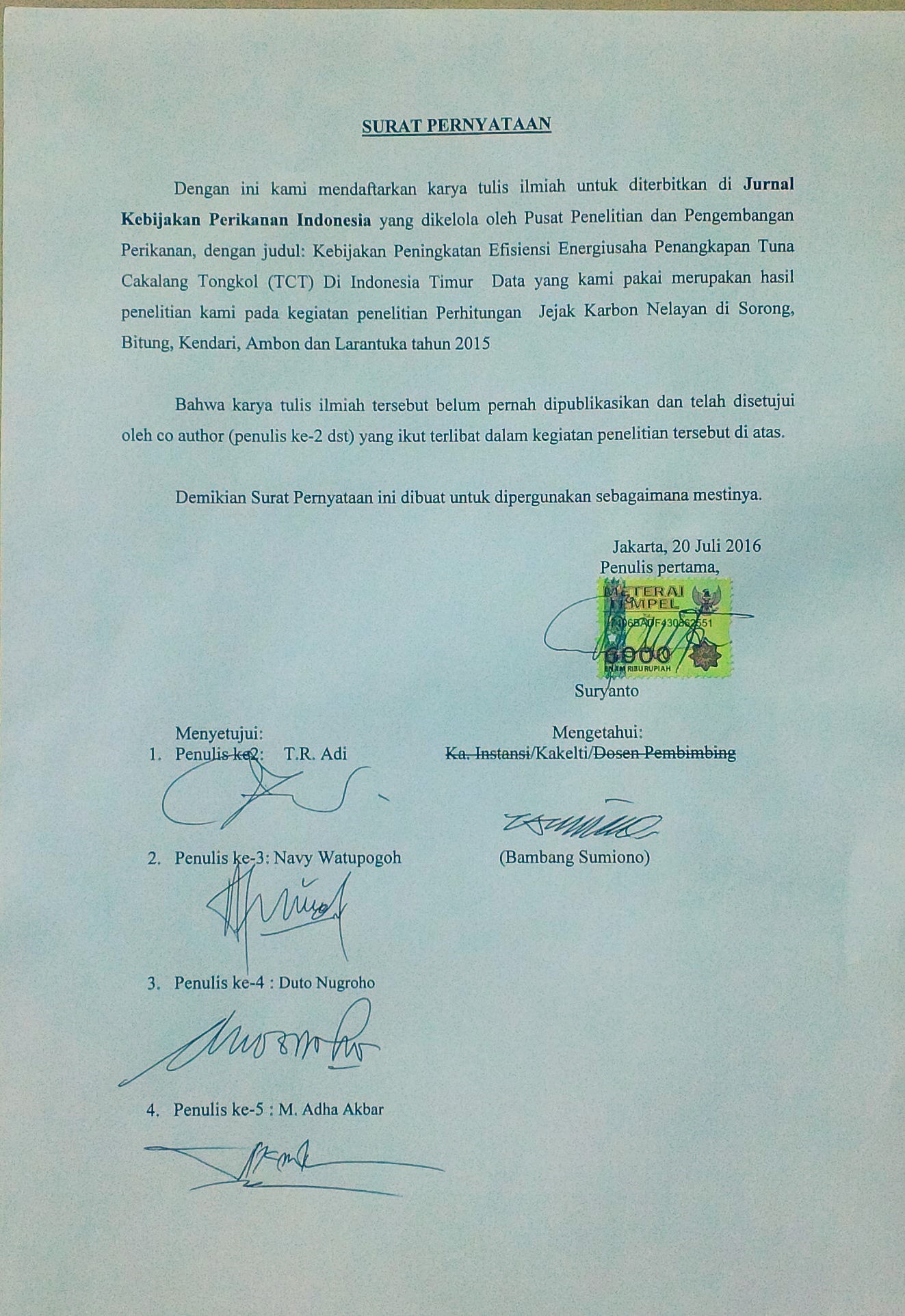 Suryanto, Wudianto, Nugroho, D. Bambang, S., Widodo, A. A., Kasim, K., Puji, R., Reny, P., Dian, O., Priyo, S.S., Ria, F., Sandi, W., Ignatius, T. H., Regi, A., Aisyah, Setiya, T., R. Adha, A.M., Navy, N.J. W., Andreas, S. S. (2015). Laporan Akhir Perhitungan Jejak Karbon Nelayan. Pusat Penelitian Pengelolaan dan Konservasi Sumberdaya Ikan. Badan Penelitian dan Pengembangan Kelautan dan Perikanan.